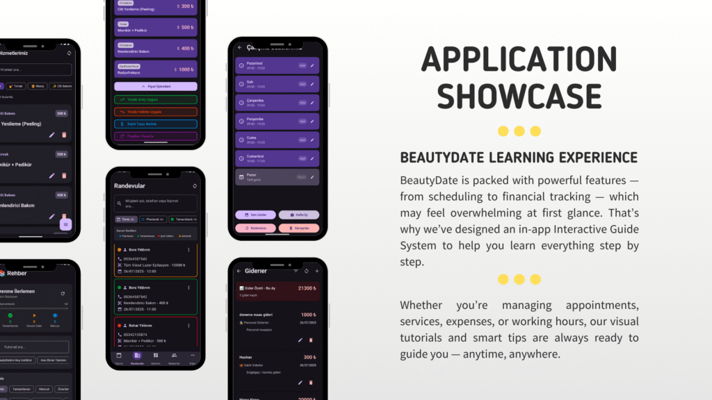 Bora’nın yaptığı bu güzel uygulama güzellik salonları için geliştirilmiş, çok işletmeli (multi-tenant) yapıya sahip, randevu planlama, müşteri yönetimi, çalışan takibi, hizmet oluşturma, analiz, takvim ve finansal izleme gibi kapsamlı özellikler sunan %100 profesyonel, güzellik salonlarının dijital dönüşümünü sağlayan bir uygulama. Aynı zamanda kendisi için de çok güzel bir portföy projesi olmuş. Tüm kodlarını GitHub’ta da bizimle paylaşan Bora’ya çok teşekkür ediyoruz.