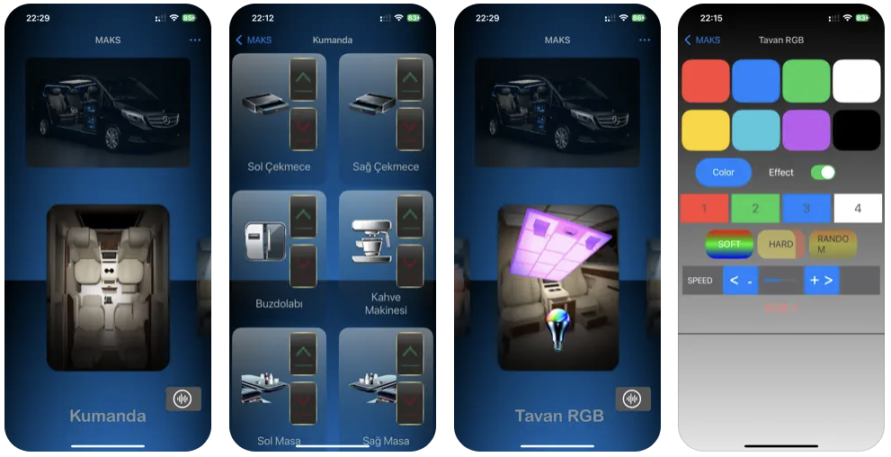 Ahmet’in yaptığı uygulanın ismi MAKS (Mobil Akıllı Kumanda Sistemi). Bu kumanda sistemi VIP araçların içerisindeki donanımları (TV, masalar, buzdolabı, koltuklar, kahve makinesi gibi) iPhone ve iPad ile kontrol etmeye yardımcı olan bir mobil yazılım. Ayrıca firebase desteği ile her araca ayrı bir menü tasarlanabiliyor. Bu mobil yazılım yine Ahmet’in tasarlamış olduğu MAKS kontrol cihazlarına Bluetooth ile bağlanıyor ve mobil cihazlardan gönderilen komutlara göre bu cihazlar açma kapatma işlemlerini yapıyor. Sesli komut, ambiyans ayarları, renkli led animasyonları gibi bir çok özellik barındırıyor.